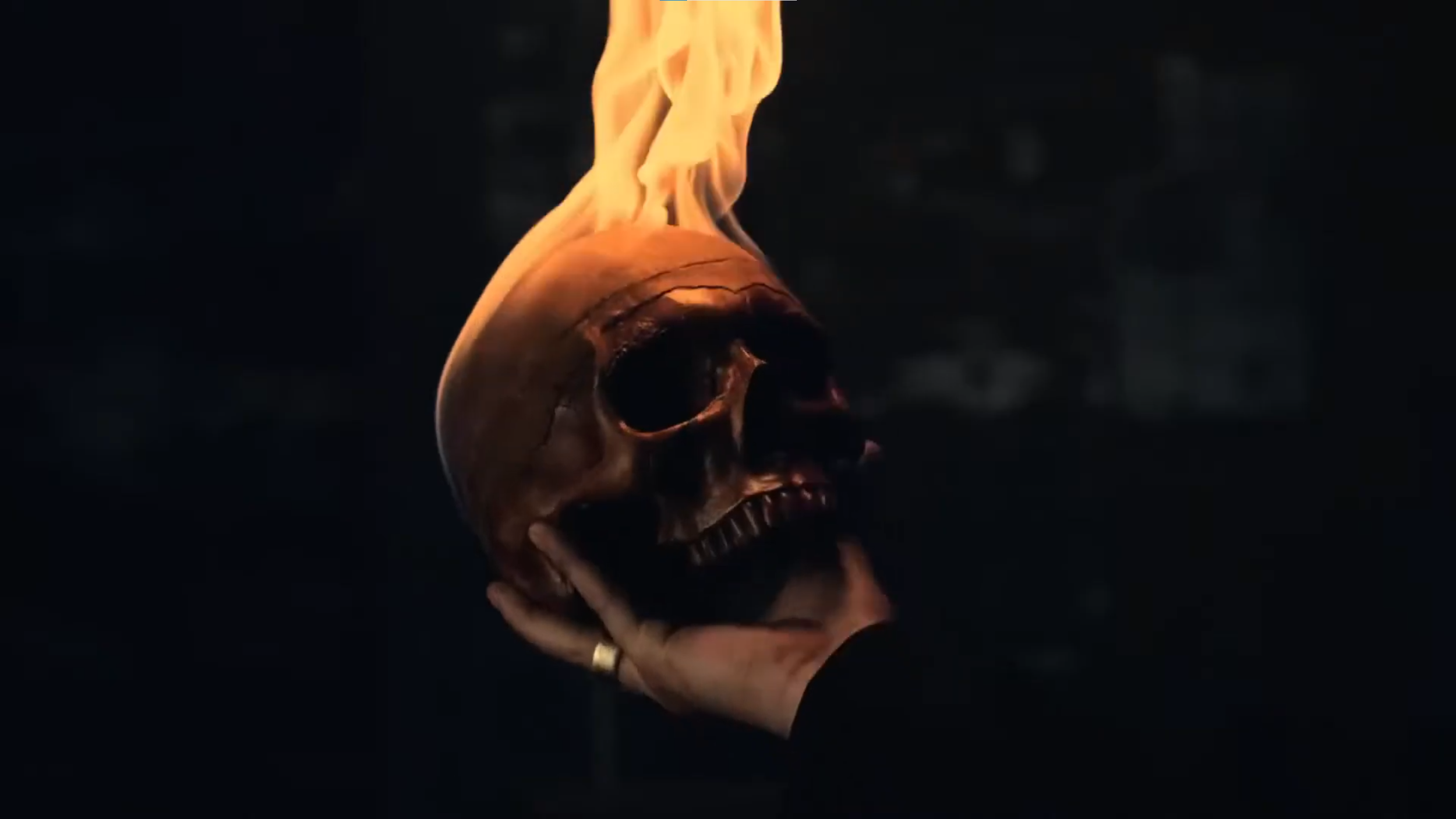 A burning skull clad in fabric doused in isopropyl to give a clean smokeless burn.