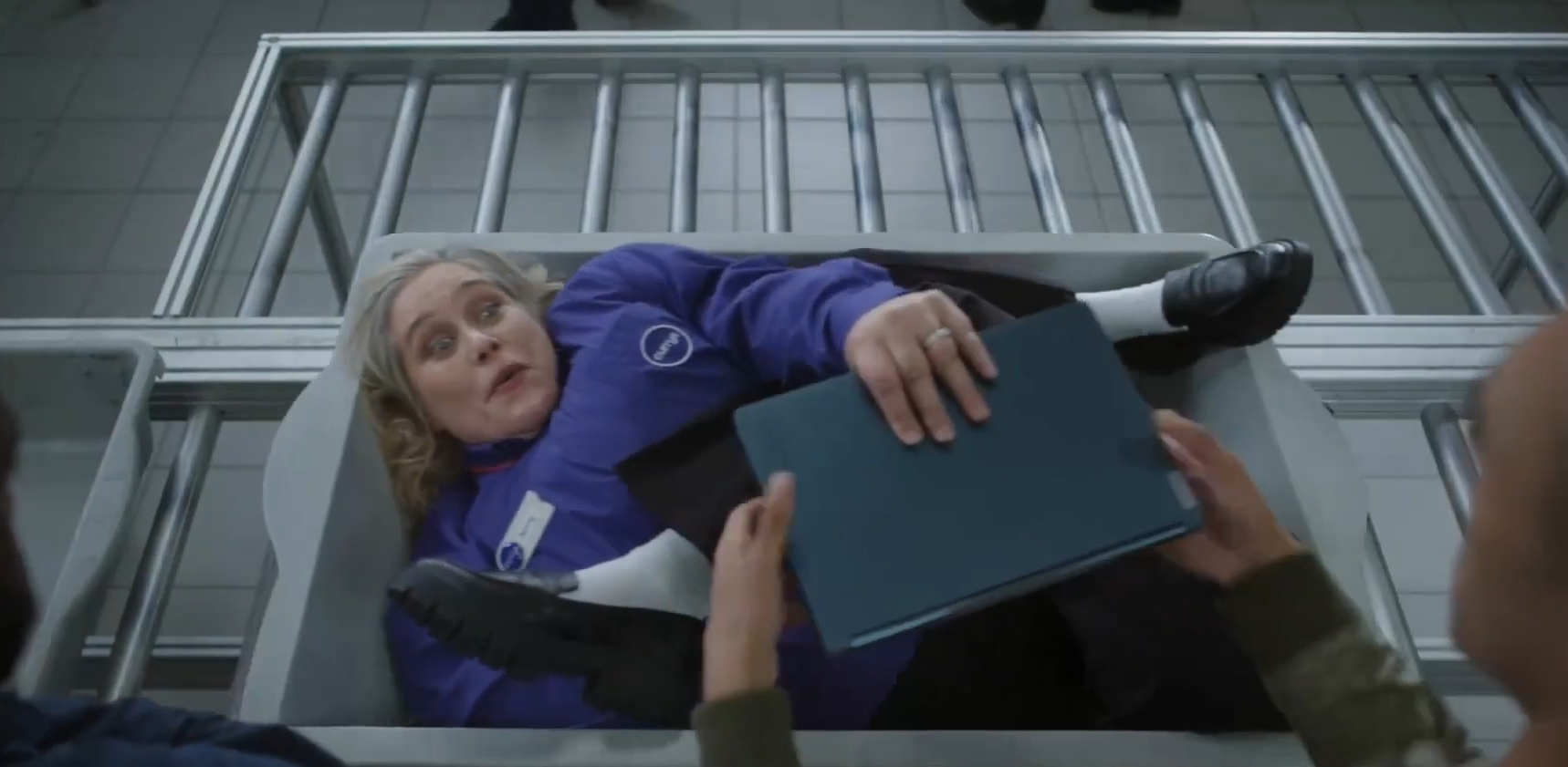 An airport baggage check was replicated with aluminum extrusion and rollers under which a skate could be pushed to give the illusion of an employee squished into a tray. In additon to this a school dinner serving area was built from CNC plywood and diebond in which an employee was submerged in baked beans.