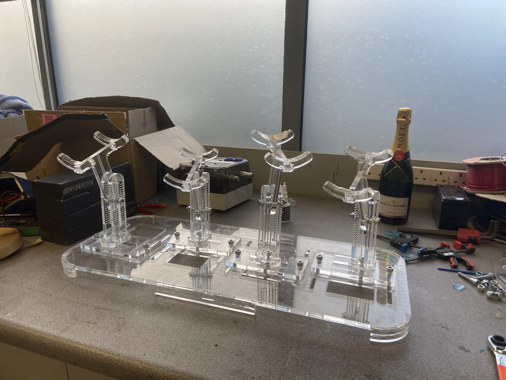 Laser cut from clear acrylic this rig allowed four bottles to be positions with four degrees of freedom including horizonatal and lateral travel via a main baseplate, vertical travel along the main support strut and angularly using a second base plate. This allowed for all four bottles to be indiivudally postioned and locked off for shooting stills.