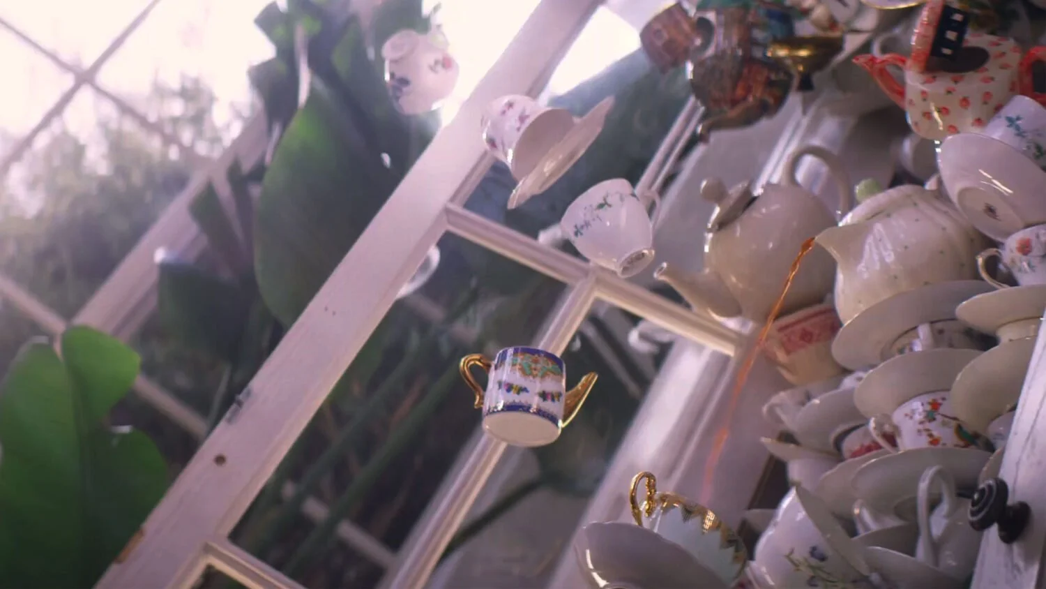 A freeze frame collapsing china cabinet consisting of a plywood backer on which bent steel rods were mounted. A selection of cups are suacers were drilled out and mounted onto the bent rods with some being suspended to fill out the foreground.